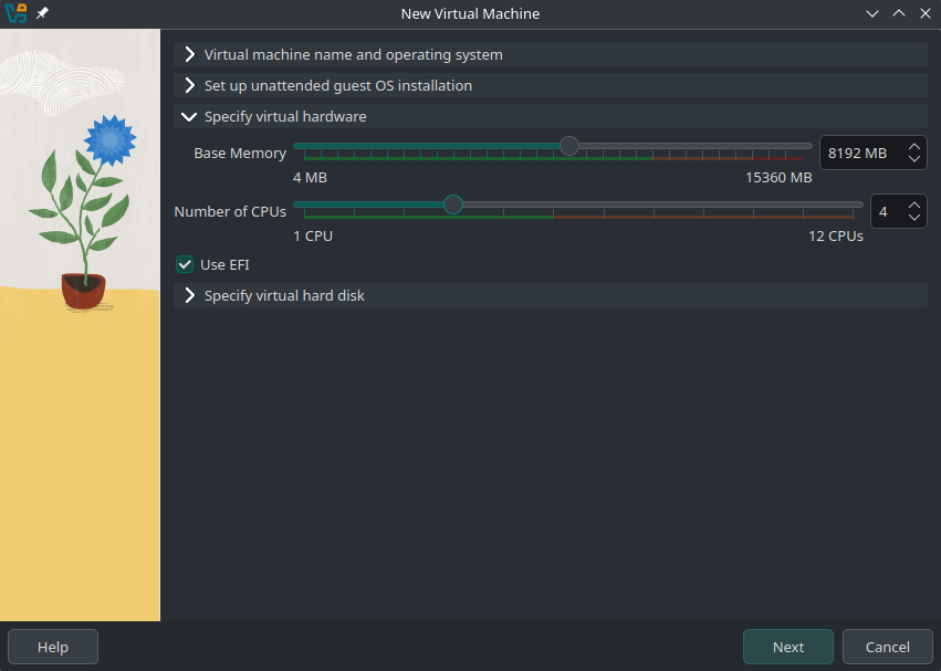 - Установите размер оперативной памяти 8192 байт, количество доступных ядер — 4. Установите галочку «Use EFI»