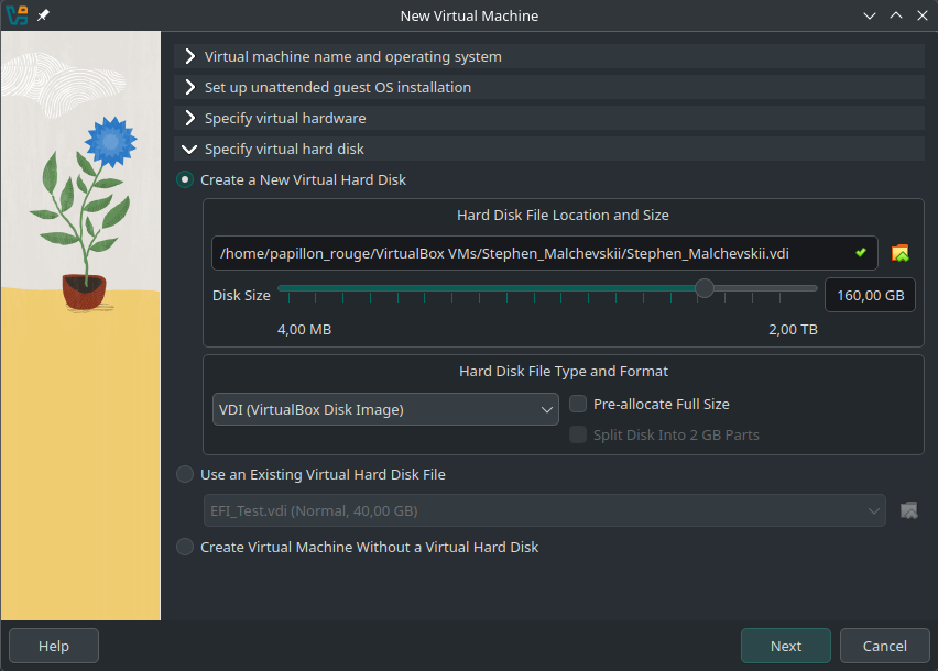 - Создайте виртуальный жёсткий диск размером от 80 Гб (предпочтительно — 160 Гб)