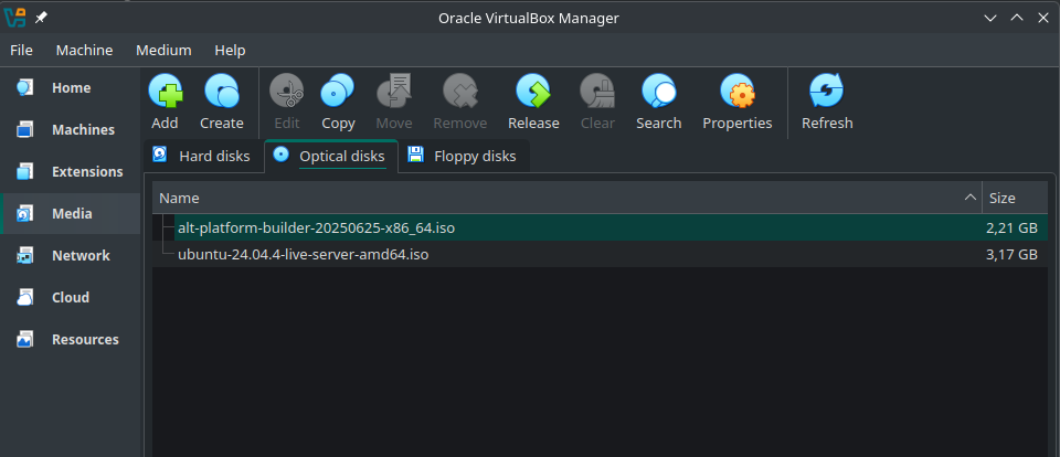 - Установите загрузочные диски двух ОС: Ubuntu Server и Alt Platform Builder. В разделе «Media» выберите «Оптические диски» и добавьте оба диска в в приложение.