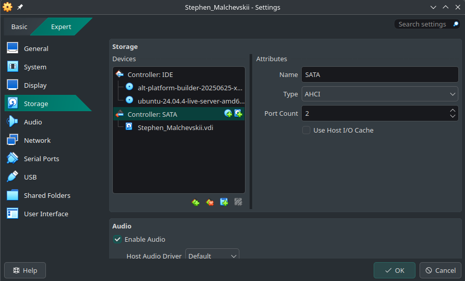 - Название виртуальной машины должно совпадать с вашими именем и фамилией, записанными латиницей через нижнее подчёркивание (например, Мальчевский Степан → «Stephen_Malchevskii»)